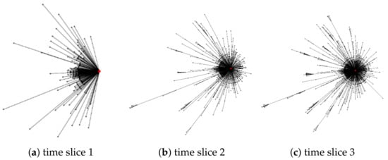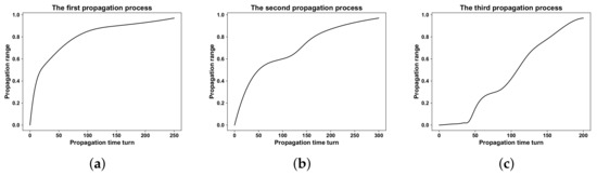 In the second propagation process, a similar pattern emerges, with information initially emanating from user nodes with a substantial following. However, during the early stages of dissemination, user engagement with the information is relatively low, leading to a slower rate of propagation. At a critical inflection point, nodes with a significant number of subscribers begin disseminating the information. This action effectively revitalizes the information’s temporal relevance, piquing the interest of other users and accelerating the dissemination process.