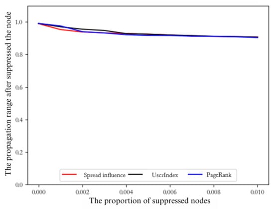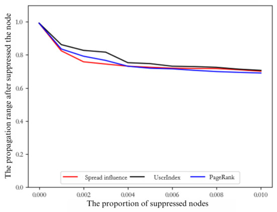 Different methods for calculating influence are employed to curtail the spread of nodes, resulting in varying degrees of reduction in information propagation. In accordance with the influence propagation calculation method proposed in this study, the suppression of information propagation in the top k nodes with the highest influence yields superior control over the propagation range, outperforming alternative methodologies. As depicted in the accompanying figure, it is evident that nodes with the highest propagation influence, ranking within the top 0.2 percentile of the inhibition network, exhibit greater efficacy in curtailing the spread of information compared to nodes with the highest UserIndex or PageRank values within the same percentile of the inhibition network. In comparison to alternative node influence assessment techniques, the method introduced in this paper demonstrates a more effective capacity to influence the dynamics of information dissemination within the network.