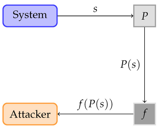 Note that in this paper, observations are divided into input observations (i.e., the projections of the strings generated by a system) and output observations (i.e., the strings observed by an external attacker). Let us abuse the terminology to say that these two types of observations correspond to the inputs and outputs of a system, respectively. A non-numerical query function f is proposed to describe the relation between the input and output of a system. If a system generates a string s, an observer will observe (i.e., an output observation) instead of as shown in Figure 2. Generally, if no mechanism that can affect the output observations exists, we assume that .