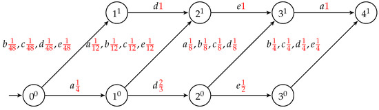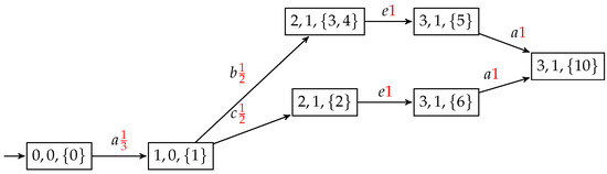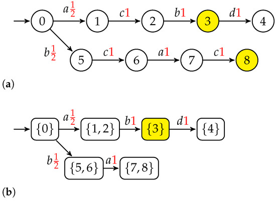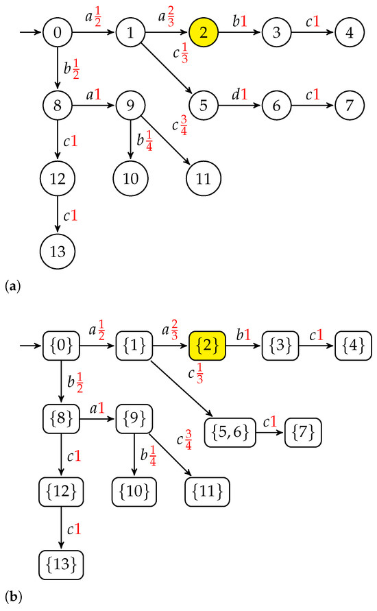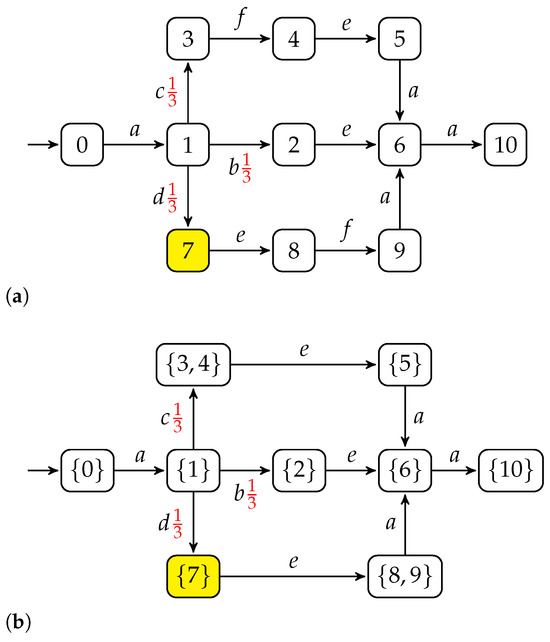 Here is a medical system of monitoring and treating the patient’s condition; it has three possible developments modeled as shown in Figure 8a. State 7 marked in yellow, for which there is a one-third probability of being reached, is related to patients’ privacy, i.e., this state is a secret state. The set of observable events is presented as and the event f is unobservable in the system. For outside observers, the observation of the modeling is shown in Figure 8b. In all figures of this section, the probability of an event occurring in each state is marked in red.