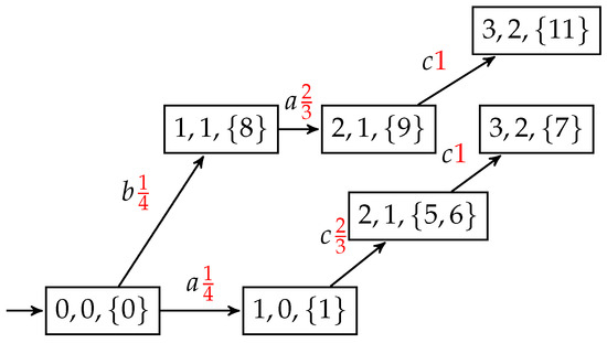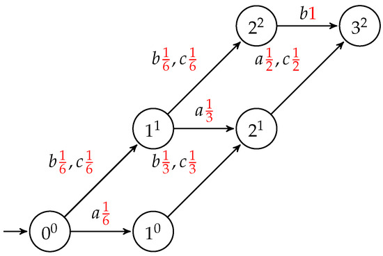 Given a Levenshtein distance , the distance-limited Levenshtein automaton for all strings of length three with a distance 2 from a string is obtained by the method as shown in Figure 6. We remove the generated strings whose Levenshtein distance is not 2 to . For state , events a and b can lead the system from state to reach state , and we have and . For the state , two reachable states need to be computed separately, i.e., and . Then, we have . In state , the output probability of event b is . Similarly, the output probability of every event in every state can be computed, which is marked in red in Figure 6.