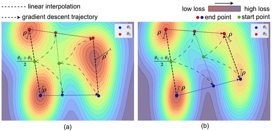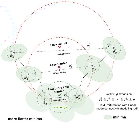 Seeking linear mode connectivity during training implies partial flatness, meaning the existence of low-loss regions along the direction of a specific vector [,,,]. In sharpness-aware optimization, a surface represents the local minimum, with a defined center and radius, ensuring linear connectivity between any two points within the basin. This implies that the line connecting the two furthest points in the basin corresponds to the basin’s diameter in the flatness model of the local minimum, as discussed by [,]. Methods for identifying connectivity include improvements in gradient descent (SGD) [,] and heuristic approaches [,]. Building on previous work, the process begins by selecting two points that are separated by significant loss barriers []. Then, the distance between them is gradually reduced while maintaining flatness, until a termination point is reached, signifying linear connectivity. This process helps identify a broad flattened basin. When combined with SAM optimization using a fixed hyperparameter , this resembles an implicit pinching strategy, aimed at locating a region with a broader .