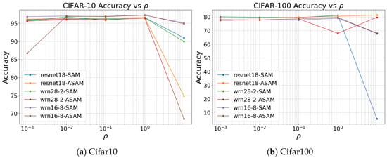 As demonstrated in previous work [,], both SAM (Sharpness-Aware Minimization) and ASAM (Adaptive Sharpness-Aware Minimization) have shown strong robustness to label noise in training data, making them effective in noisy environments. Building on these findings, we performed experiments using symmetric label noise at various noise levels: 0.2, 0.4, 0.6, and 0.8. This symmetric noise was introduced to mimic the effect of noisy or mislabeled data during the training process.