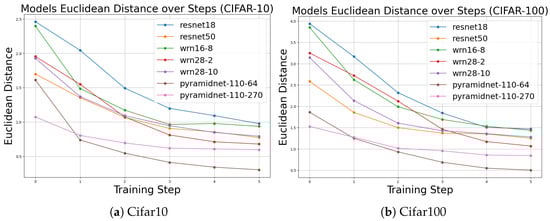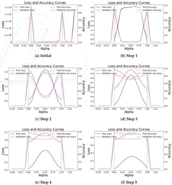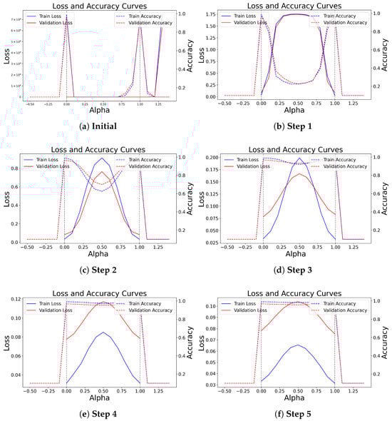 The loss variance between two endpoints is a robust criterion for terminating iterations, ensuring consistent performance. Table 7 shows the loss variance of linear interpolation models between the endpoint models at each step. As iterations increased, this variance decreased monotonically. Optimal results typically occurred near the minimum variance step, except for ResNet-50 on CIFAR-100. Due to shared hyperparameters, PyramidNet-110-270 required more steps to reduce variance. We proposed a threshold of 0.1 as a stopping criterion. Additionally, visualizing the loss curves of the interpolation models at the conclusion of each iteration step provides significant insights, as shown in Figure 5 and  Figure 6. Such visualizations enable the assessment of endpoint model convergence and facilitate a comparative analysis of the performance of the two endpoints, thereby informing decisions on whether to proceed with further iterations.