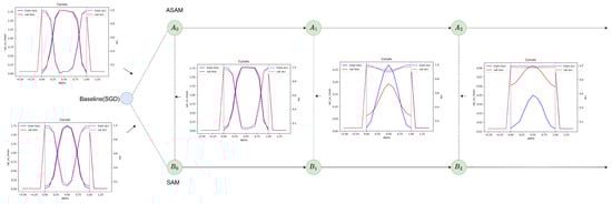 Visualizing the weights obtained at each step helps with error analysis. First, compare the weights obtained by the different optimizers and their performance metrics. In Figure 10, the linear interpolations among SGD, SAM, and ASAM exhibit higher loss barriers, suggesting that these optimization methods converge to distinct solutions. Meanwhile, there was no significant difference in performance, suggesting that the current training hyperparameter settings were reliable. Second, analyzing the performance connectivity between the current and previous steps helps determine whether the search iteration has introduced any biases, such as checking whether the distance regularization term produced the expected effect. Third, a comprehensive analysis of the connectivity between the solutions at each step can help determine if the process is converging to a flat region. In a good optimization process, the linear interpolation loss barriers between the models at later steps show a decreasing trend, indicating that the search direction is likely becoming flatter. Otherwise, it may be necessary to return and adjust the training hyperparameters.