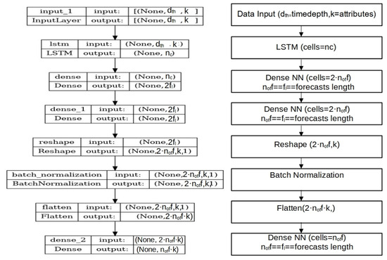 Generic construction flow diagram of each LSTM strand having as the number of cells, , the number of forecast steps, k as the number of attributes, as the learning depth, and .