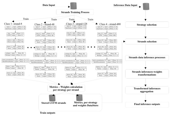 The model’s multiple training processes per class and inference process are illustrated in Figure 3. For Figure 3, data input is set to ( = 5, k = 3). Then, for each LSTM strand, a different cell depth strand trains on the data, providing several values by the LSTM cell length as output. The output of 18 values per strand corresponds to 6 forecasts of the three data attributes. The inference process follows a similar logic. Let input inference data for forecasting of (, k), where the history depth and k the data attributes. Then, according to the model-selected strategy described in Section 2.3, a strand or multiple LSTM strands will be selected to provide inferences, and according to the selected strategy weights, the weighted aggregation of LSTM strands inferences will be the model’s forecasting output of forecasting length . For classification problems, the classification vector (, 1) is used instead of the (, k) array.