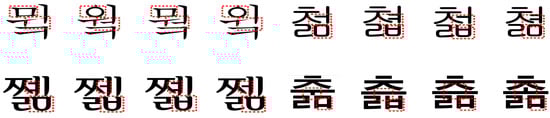 - Ham, D.S.; Lee, D.R.; Jung, I.S.; Oh, I.S. Construction of printed Hangul character database PHD08. J. Korea Contents Assoc. 2008, 8, 33–40. [Google Scholar] [CrossRef]