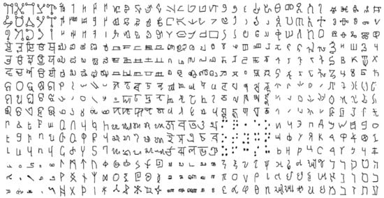 Omniglot contains 1623 characters from 50 different alphabets (Figure 5). It consists of not only international languages like Korean and Latin, but also lesser known local dialects and fictional character sets such as Futurama and Klingon. Each of these was hand drawn by 20 different people. The number of letters in each alphabet varies considerably from about 15 to upwards of 40 characters. All characters across these alphabets were produced a single time by each of 20 individuals. The dataset is composed of two subsets: images_background, containing 19,289 images, and images_evaluation, containing 13,180 images.