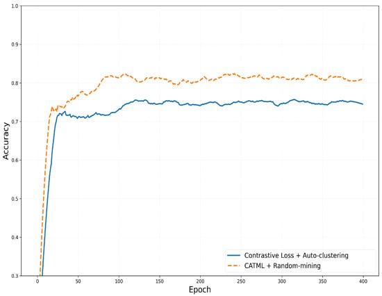 The results of the experiments with a large number of classes are presented in Table 2. The results of random-mining, hard-mining and distance-based mining were taken from the work [11]. The CATML function showed notable accuracy (Figure 7) compared to all previous results.