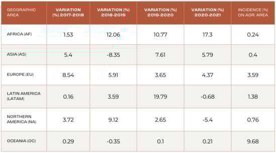 The expansion of organic farming on a global scale continues, although it is still limited in terms of the extent of cultivated areas. According to the FiBL (Source: https://statistics.fibl.org/world.html (accessed on 1 October 2023) data for 2021, both the area dedicated to organic farming and the market itself are recording increases compared to the previous year in several countries. This increase translates to an overall growth of 1.7% for the area (equivalent to an increase of 1.3 million hectares), while the market shows a more consistent growth, with an increase of 5%. However, situations vary considerably geographically, as we can see from Figure 1. In particular, regions such as Africa and Asia, while starting from low levels of organic farming land, are recording significant increases, with increases of 7.3% and 5.8%, respectively, only during 2021. On the contrary, regions such as Oceania and Europe are experiencing a stabilization or even a reduction of the biological surface, despite the fact that, traditionally, Oceania has represented a significant part of the agricultural area dedicated to organic farming (9.7%).
