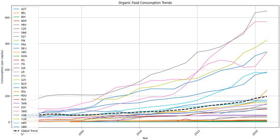 Therefore, we applied missing data imputation, more specifically, we employed a refined form of data elimination, specifically targeting records with excessive missing values beyond the year 2009. This approach was deemed necessary to preserve data integrity, as the complete elimination of records with missing values over the entire time span would lead to a significant loss of information given the relatively small size of the dataset. The reason for focusing on data from 2009 onwards was purely statistical and for data availability purposes. In this way, we mitigated the loss of information while ensuring the removal of records with substantial missing data. Interpolation, another common method for handling missing data, was considered less suitable in this scenario. This decision was based on the observation that missing values often occurred consecutively for multiple years within the same records. Interpolating such data would introduce potentially misleading trends and inaccuracies, given the non-linear nature of organic food consumption patterns.