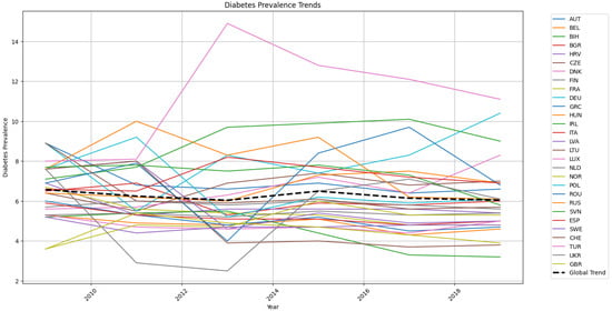 In Figure 4 and Figure 5, we present an overview of the incidence of cancer and diabetes in European countries. Notably, among all nations, Turkey exhibited the most significant deviation in diabetes prevalence values, reaching a peak in 2013 before gradually decreasing until 2019, while consistently maintaining higher rates compared to other countries.