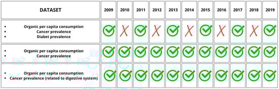 Therefore, taking into account both the restriction of the temporal range to the years after 2009 due to the excessive lack of data on organic consumption and the biennial frequency of data on diabetes prevalence, the final dataset, including all three features (organic, cancer, and diabetes) will have data from 2009 to 2019 every two years. Instead, for the other two datasets concerning only organic consumption and prevalence of cancer (total or only related to the digestive system), we will have all the years from 2009 onwards. All the final datasets have a time horizon that stops at 2019, and this is due, as mentioned above, to the ‘obsolescence’ of the cancer dataset. Figure 6 shows a general overview of the above: rows correspond to the three datasets created, which differ depending on the variables considered; columns show the years available or not for each dataset.