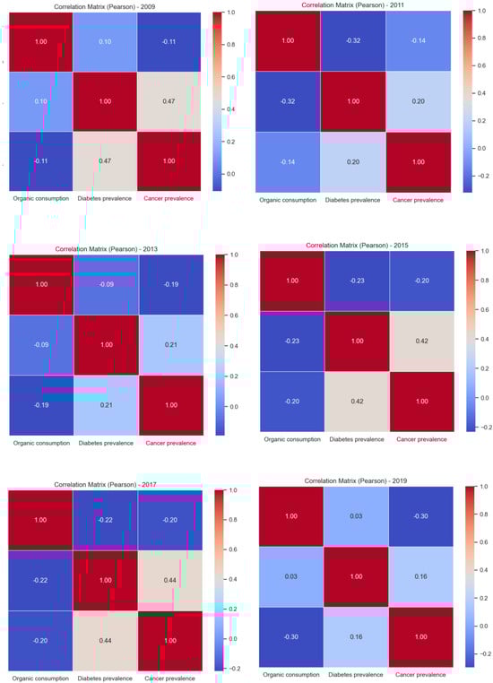 Looking at the year-by-year correlations, there are variations in the ratio of variables over time. For example, in 2009, there was a slight negative correlation between organic consumption and cancer (−0.11), while there was a positive correlation with diabetes (+0.10). These results indicate that in 2009, organic consumption may be associated with a lower incidence of cancer, but not necessarily diabetes. In general it can be noted that over the years, the correlation between organic consumption and the prevalence of cancer tends to increase, reaching −1.2, while that between organic consumption and the prevalence of diabetes oscillates randomly between −1.2 and 0. We found the greatest negative correlation between organic consumption and prevalence of cancer (−0.30) in 2019, while the correlation with prevalence of diabetes is close to zero (+0.03), indicating a possible reduction in the association between organic consumption and diabetes. Overall, the results suggest that there is an inverse association between organic consumption and the prevalence of cancer and diabetes, although the exact nature of this relationship may vary over time and may be influenced by other factors. The correlation matrices are released in the github folder https://github.com/GiulioAngiolini/organic-and-disease (accessed on April 2025). To further explore the correlation statistics, we also report the results for each year independently in Figure 8. The patterns of the various years results to be similar, witnessing a similar behavior happening across the various years analyzed in the study.