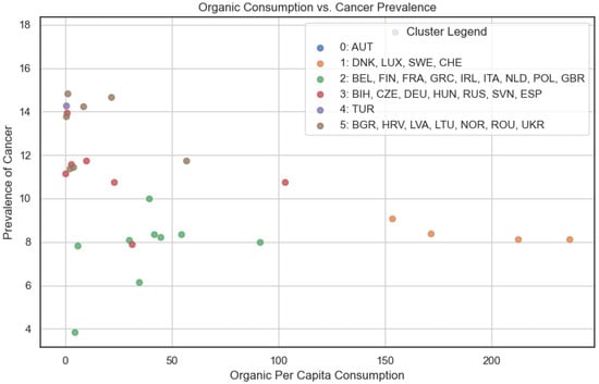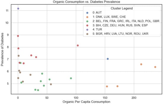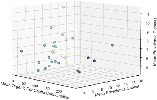 On the other hand, the distinctive feature observed within the second cluster lies in the strengthened negative correlation among the variables. While examining the broader correlation patterns across all nations, the Pearson correlation coefficients between organic consumption and the prevalence of diabetes, as well as between organic consumption and cancer prevalence, yielded relatively modest values of −1.17 and −1.20 (Figure 7), respectively.