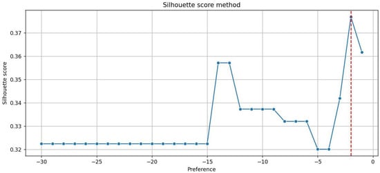 The clustering algorithm partitions the data into groups or clusters based on similarity or distance metrics. The goal of clustering is to group together data points that are similar to each other while being dissimilar to points in other clusters. This enables the algorithm to discover natural groupings or clusters within the data, which can then be used for various purposes such as customer segmentation, anomaly detection, or data compression [,,,]. In our work, we employed Affinity Propagation (AP), which can be collocated into the Exemplar-based clustering class and has been widely applied to several fields [,]. The Affinity Propagation algorithm, proposed by Frey and Dueck, is based on the concept of “message-passing” between data points to identify cluster centres and assign data points to these centres automatically. Data points exchange between them two messages, one of responsibility and one of availability , which indicates how well-suited a data point is to be a potential exemplar. After iterative message passing, exemplars can be identified by calculating the maximum of for point i. If , point i is selected as an exemplar, or point k is the exemplar of point i []. In our experimental settings, we performed a grid search over the hyper-parameters of the Affinity Propagation algorithms, choosing the best configuration that would maximize clustering similarity. We selected AP over hierarchical and spectral clustering due to its ability to automatically determine the number of clusters without requiring a predefined value, which is particularly advantageous given the inherent complexity and variability in our dataset. Additionally, AP identifies representative exemplars within each cluster, providing enhanced interpretability—an essential factor for our application. Unlike spectral clustering, which relies on eigenvalue decomposition and may struggle with scalability for large datasets, AP efficiently handles complex cluster structures without assuming convexity. Moreover, compared to hierarchical clustering, AP avoids the need to define a linkage criterion, which can be challenging in high-dimensional spaces. These are the main reasons we decided to choose AP over other possible valid choices, such as HDBSCAN or further unsupervised non-partition-based clustering solutions.