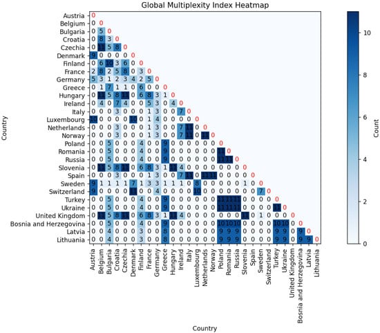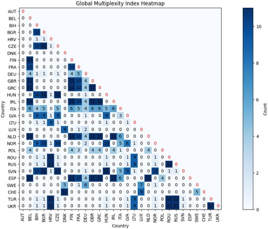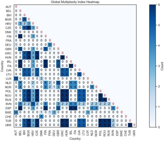 In essence, the global multiplexity index underscores the significance of exploring the collective community memberships across different network layers to uncover hidden connections and similarities between nodes. We formalized this idea as the global multiplexity index of a pair of countries [] (i, j):
