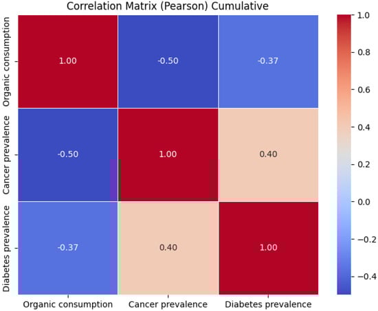 From the results of Pearson’s correlation analysis between organic consumption and the prevalence of cancer and diabetes, an interesting scenario emerges.