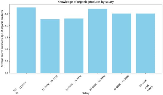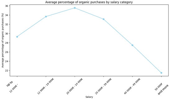 In particular, to analyze responses regarding the proportion of organic purchases, a mapping dictionary was constructed. This dictionary translates textual responses into corresponding numerical values: for instance, the response ‘80% organic–20% non-organic’ is given a value of 80. Then, the average of the values associated with each income bracket is calculated.