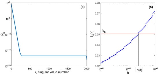 where are uniform grids on the interval . For , and , the matrix has the condition number , i.e., it is extremely ill-conditioned. This is due to the specific (exponential) order of decreasing singular values of the matrix (see Figure 1a). By applying the TSVD method to the matrix, i.e., for example, by replacing its singular values that satisfy the condition with zeros, it is possible to improve the condition number with an adequate choice of the value h. Thus, for , we obtain the matrix with the best condition number . Accordingly, the stability of numerical solutions of SLAE with such a matrix is improved. However, it is not clear how to constructively find h, since the estimate h of the admissible proximity of matrices in the considered formulation is unknown.