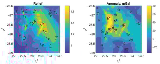 We consider Problems 1 and 2 in a discrete formulation (6), , with practical data Y on gravity and magnetic anomalies, and we will solve these problems using the MPMI algorithm. The algorithm was applied to processing gravimetry and magnetometry data for the region of Kathu, Northern Cape, South Africa, with latitude and longitude °°°°], °°. All source data, including relief data, and grids were taken from the WGM2012 GLOBAL MODEL [26] (gravity data) and WDMAM [27] (magnetic data) databases. The grids of data and sought solutions were taken to be identical. The problems were solved for different depths H of the plane of sought field sources. Accordingly, for the gravity and magnetic problems, based on the relief, given grids and H value, the matrices linking the columns of unknowns and data of these problems were calculated. The matrices have the following dimensions: . In all calculations, it was assumed that the gravitational data and magnetic data were measured with a relative error of .