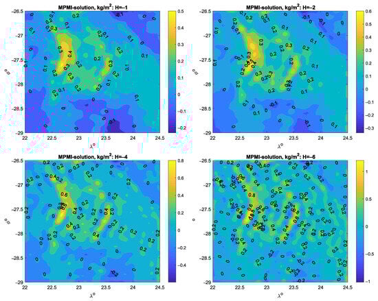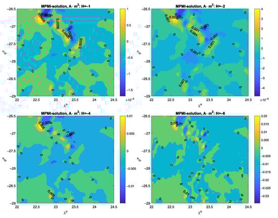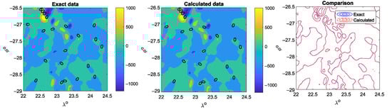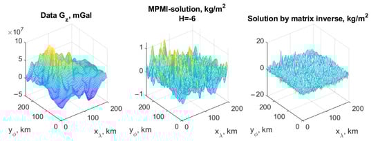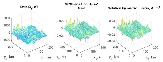 Inverse problem of magnetometry. Similar results of magnetometry data processing are shown in Figure 6, Figure 7, Figure 8 and Figure 9. In particular, Figure 9 presents a comparison of solutions of the inverse problem for different depths H. The discrepancy between the exact and calculated data, and , is about here. It turned out that the matrices of this inverse problem are well conditioned for the depths H under consideration. Therefore, the results of the solution by the MPMI method and by means of matrix inversion differ little.