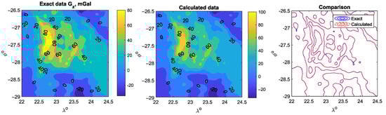 The next Figure 4 shows the isolines of the data and their analogues calculated using the solution of the inverse problem. A comparison of these results is also given. The discrepancy between the exact and calculated data, and , is about . Their isolines are graphically close. Note that similar comparison results, as in Figure 4 and Figure 5, were also obtained for other depths H. For brevity, they are not presented.