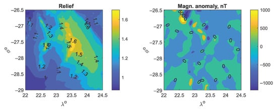 The joint solution of the gravity and magnetic problem was carried out with the data for the region of Kathu, Northern Cape, South Africa, from Section 7. In this case, .