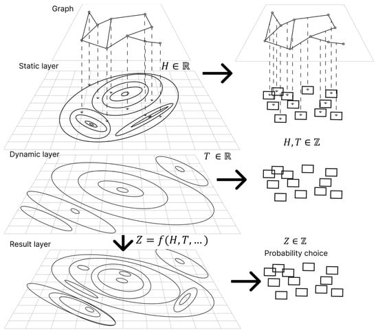 In ACO, each parameter value is defined by the sets and , where is the set of parameters; is the set of admissible values; is the amount of pheromone weight for the parameter value; and is information about the arc length. This paper proposes to represent the information required by ACO as a set of layers (Figure 1). The layers are divided into static, which do not change between iterations of ACO, and dynamic. For discrete problems, the values of each layer can be represented as matrices. Information about the arc length forms a static layer of values . does not depend on the iteration number . Based on the static layer, the problem can be solved using various algorithms for the traveling salesman problem; Dijktra’s methods, branch-and-bound methods, or dynamic programming can be used. Unique to ACO is the dynamic layer , in which the assignment of pheromone weights to each graph arc is determined. At the initial stage of the algorithm, the values of the dynamic layer are the same, and therefore, this layer does not affect the probability of the agent choosing an arc. Gradually, the value of the dynamic layer changes, and it is the dynamic layer that plays a significant role in the agent’s choice of an arc.