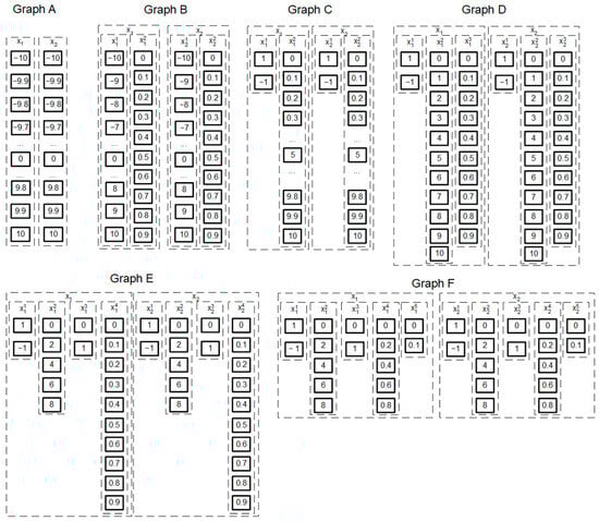 - Selection of the negative part: Each layer is divided into the sign (2 vertices) and the positive part in the interval [–10…10] with a step of 0.1 (101 vertices). . In total, the parametric graph has 2 layers for each parameter and 40,804 vertices. See Graph C in Figure 3.