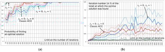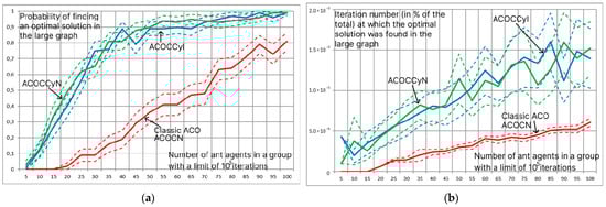 In the problem of small dimensions, the optimal values of the system parameters are already determined at early iterations, and the use of the modifications ACOCN, ACOCNI, ACOCCyN, and ACOCCyI is distinguishable only when continuing the search in order to ensure the enumeration of all parameter values or the search for all optimal solutions. In the case of the problem of large (more than solutions in total) dimensions, the ACOCN and ACOCNI algorithms are close to stagnation and begin to converge to good, rational solutions. The ACOCCyN and ACOCCyI algorithms allow one to completely avoid stagnation processes due to a repeated cyclic search for solutions and demonstrate high efficiency (Figure 7). . The dotted lines in the figure indicate confidence intervals for a significance level of 0.95. Already with 50 ant agents per iteration, the ACOCCyN and ACOCCyI algorithms, with a probability of more than 90%, determine the optimal solution in iterations. A further increase in the number of ant agents per iteration leads to an increase in the iteration number at which the optimal solution will be found.