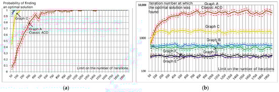 When studying the possibility of decomposing all parameter values into separate layers with subsequent linear convolution, it was found that ACO works well with low-dimensional graphs. Figure 6 shows graphs of the estimated probability of finding an optimal solution for a given number of iterations (Figure 6a) and the estimated mathematical expectation of the iteration number at which the first optimal solution was found (Figure 6b) for the structures shown in Figure 3 (). The red graph represents a graph similar to the graphs applicable in ACO-LSTM, in which each parameter forms a layer. The graphs show that the maximum decomposition to Graphs E and F not only allows us to find the optimal solution earlier but also determines it with a higher probability even at a small number of iterations. Graphs B and D also demonstrated high efficiency, in which the decomposition of a real value is carried out into tens, integers, tenths, hundredths, etc. The automatic creation of such graphs is significantly simpler than the creation of Graphs E and F.