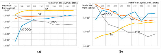 - Calculation of the new values of matrices and : First, all values of matrix are reduced—evaporation ,—and then, the values from ant agents are added: . The values of matrix are changed in a similar way: . This algorithm can be executed on parallel threads, each of which calculates the values of a separate parameter.