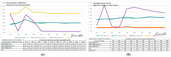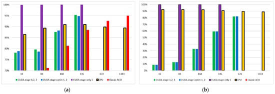 Further research into ACO was aided by the development of computing technology and the emergence of compute unified device architecture (CUDA) parallel computing cores on NVIDIA GPUs. Since GPUs can provide higher peak computing performance than multi-core CPUs and are inexpensive, researchers are more interested in parallelizing the ACO algorithm on GPUs than on multi-core CPUs []. This type of parallel ACO is based on the deep parallel attention model (DPAM). The basic concept of DPAM is to associate each ant with a group of threads with a shared memory, such as a CUDA thread block. In addition, by assigning each thread to one or more cities, the threads in the block can compute the state transition rule jointly, thereby improving data-level parallelism. In addition, since the shared memory on the chip is capable of storing ant data structures, the latency of the uncoalesced memory access method in tour construction is reduced []. In this formulation, researchers consider the GPU computer as an SIMD (single-instruction multiple-data) accelerator, assuming that each action of the algorithm is performed on different data. The results obtained from the modification of ACO for solving the TSP on CUDA for modern computing power were excellent; for example, for min–max modification [,], which is usually used together with a taboo search [], the acceleration can be more than 20 times. Close to the parametric problem is the QAP, in which the transport graph is represented by the assignment graph. With parallel implementation on the GPU, the following stages are sequentially performed: pheromone updates, solution construction, and calculation of the solution cost []. Separately, it is worth noting the study of automatic optimization of code implemented on SIMD GPUs using additional libraries. These studies show that automatic optimization methods are close in efficiency to manual optimization methods [].