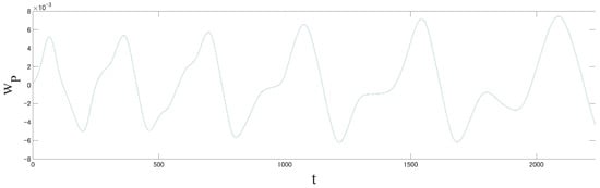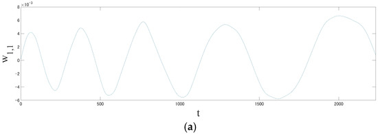 As shown in Figure 7, the synchronization process was completed in approximately 50 non-dimensional time units after the control was applied at , and the vibration of was well suppressed, with the largest amplitude shown in Figure 5 greatly reduced. Therefore, the well-suppressed vibration fully demonstrates the effectiveness of the control strategy in Equations (14)–(17) and (A25)–(A36) under the condition of external disturbance.