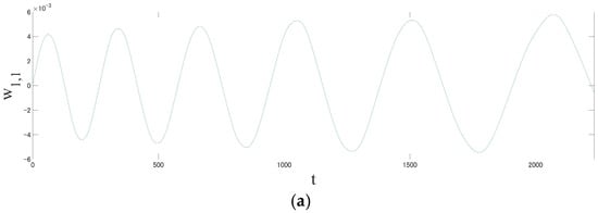 However, from Figure 6e,f, it can be learned that the largest amplitudes of and are very small compared to the largest amplitudes of in Figure 5. Specifically, they are about 0.0001286 and 0.0000021, respectively; their corresponding relative values to that of in Figure 5 are about 1.57% and 0.03%. Therefore, both and can be omitted to reduce calculation burden in numerical studies on the vibration of axially-deploying elevator cables.