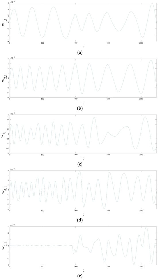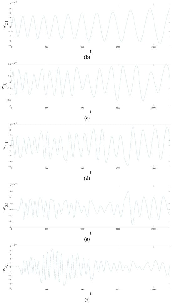 Figure 9 shows the vibrations of the first six vibration modes at the specified point of the axially-deploying elevator cable under the condition of external disturbance throughout the whole vibration control process. From Figure 9a–e, it can be seen that after control completed at , the largest amplitudes of , , , , and were about 0.005877, 0.003795, 0.001788, 0.0003938, and 0.0002934, respectively. Therefore, the first five vibration modes must be taken into consideration when comparing with in Figure 7 and Figure 8.
