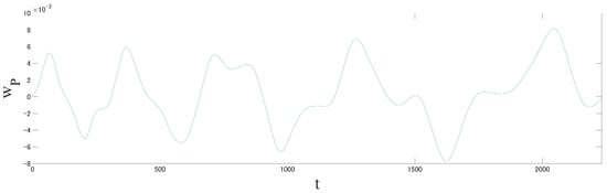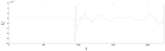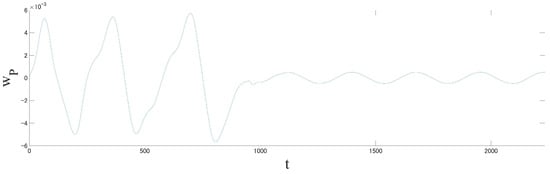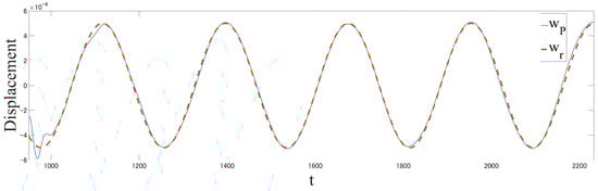 As shown in Figure 8, the fast synchronization process is further demonstrated in the displacement comparison between and under the condition of external disturbance. Once the control was applied at , the vibration of quickly synchronized within about 50 non-dimensional time units, and both the amplitude and the period of were very well synchronized. Particularly, the amplitude of was reduced from the largest value, 0.008173 in Figure 5, to about 0.00050 in Figure 8, showing a 93.88% decrease in vibration amplitude. Therefore, the very well-synchronized vibration at the specified point P fully demonstrates both the efficiency and effectiveness of the control strategy in Equations (14)–(17) and (A25)–(A36) in the vibration control of axially-deploying elevator cables, and the application of the control strategy under the condition of the external disturbance in Equation (22) also demonstrates the robustness of the control.