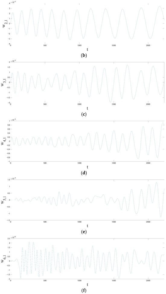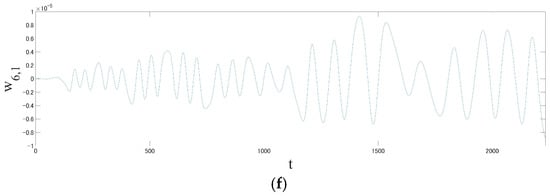 Figure 6 shows the vibrations of the first six vibration modes at the specified point of the axially-deploying elevator cable in the case of external disturbance. From Figure 6a–d, it can be seen that the largest amplitudes of the first four vibration modes , , , and are about 0.006671, 0.003425, 0.001963, and 0.000912, respectively; the corresponding relative values to that of in Figure 5 are about 81.62%, 41.91%, 24.02%, and 11.16%, respectively. Therefore, the first four vibration modes must be considered when comparing with in Figure 5.
