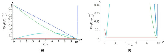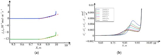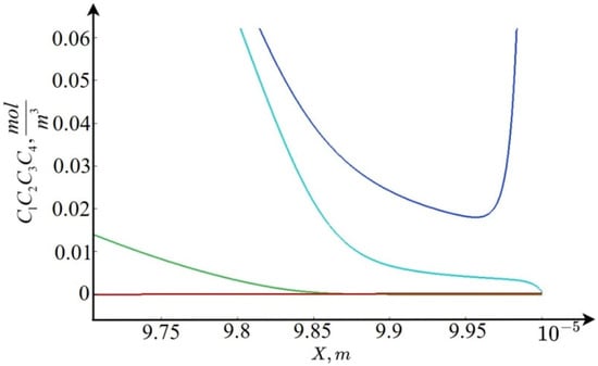 In the region , the equilibrium is shifted (the solution is acidified) due to the generation of ions (see the boundary condition). In this region, there are practically no ions (the concentration of these ions is significantly less than the concentration of ions). The concentration of cations and anions is equal with high accuracy, even if they are artificially set unequal at ; this inequality is compensated for on the artificially arising boundary layer. In the region , the value of the space charge is sufficiently small, and as a first approximation, it can be assumed that the condition of local electroneutrality is satisfied in it (Figure 2).