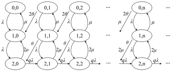 In this information scenario, based on the model assumptions and Equation (1), arriving customers will join the system, provided that there is at least one idle server. We now concentrate on customers’ join-or-balk decisions when both servers are occupied. Since customers cannot observe the real-time queue length of retrial customers already in orbit, we assume that they opt to join the retrial orbit with a probability of q and balk with the complementary probability. The system operates similarly to the original one, but the arrival rate is when both servers are occupied. Figure 1 presents the transition diagram for this case.
