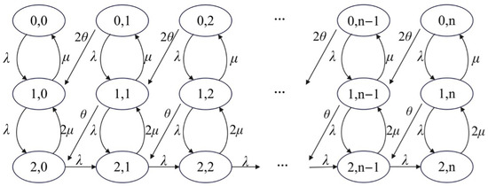 Analogous to the unobservable case, in the observable case, if arrivals find an idle server, they prefer to receive services at once. Therefore, our subsequent analysis concentrates on cases where both servers are occupied. In this observable case, customers employ a threshold-based retrial strategy: If a newly arriving customer observes that the number of customers in the retrial orbit is or fewer, they opt to join the orbit; otherwise, they balk. Correspondingly, the upper limit for the number of customers in orbit is n. Figure 2 presents the system transition diagram.