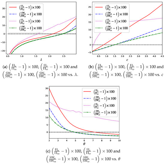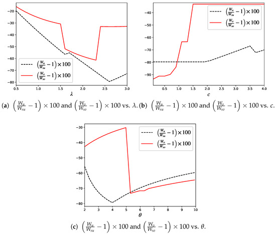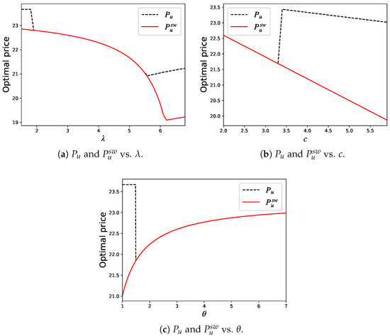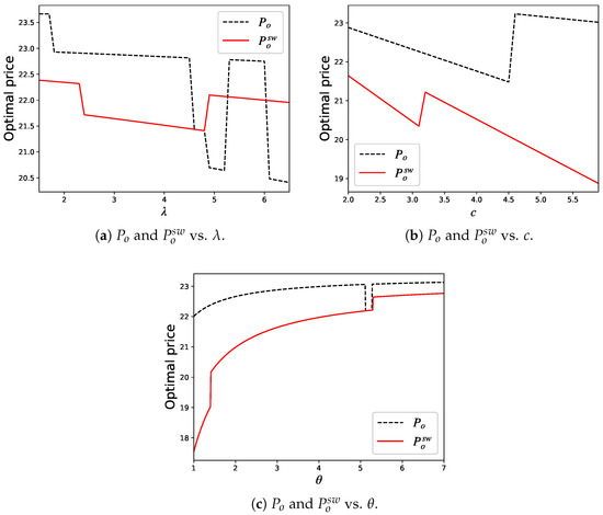 From Figure 3, we observe that the profit-maximizing price consistently equals or exceeds the welfare-maximizing price. When the parameters fall within specific ranges, such as , and , they are the same. In these situations, retrial customers obtain zero utility, no matter the profit or welfare maximization perspective. However, beyond these parameter ranges, the social planner strategically maintains positive utility to attract and retain customers. We notice that when the parameters change, profit-maximising manager and the social planner may adopt the same strategy to control prices. For example, when increases, congestion in the orbit is increased, leading customers to be hesitant about joining. Consequently, the two maximisers reduce their prices to attract customers. However, when is sufficiently large, they will increase the price to avoid the orbit from becoming more congested. In contrast, their strategies might also be different. When customers become impatient (i.e., c increases), the profit-maximising managers initially opt to lower prices, followed by a sharp increase, and then a subsequent decrease. In contrast, the social planner reduces prices, intending to retain a larger customer base. When the retrial rate changes, we observe that their strategies are different. This can be understood intuitively as follows: the social planner is inclined to provide positive utility to customers, whereas profit-maximizing managers do not have this inclination. These findings highlight the complex interplay between system parameters and decision-making objectives in pricing strategy formulations, particularly in balancing congestion management with customer behavior considerations.