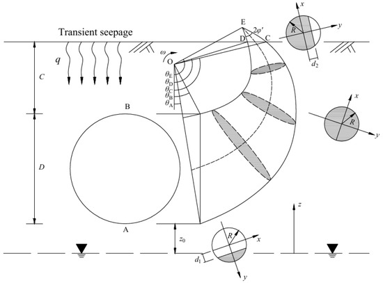 The failure mechanism’s path is determined by two logarithmic spiral trajectories, namely the curve AE and curve BE, formulated as follows: