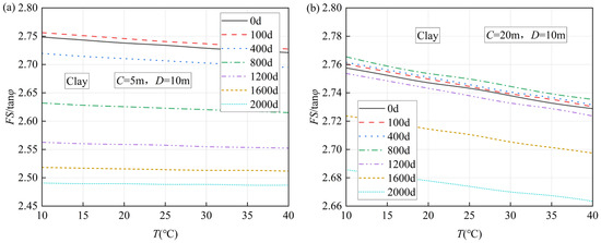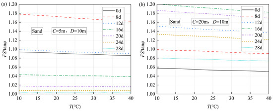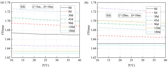 The spatiotemporal impacts of transient unsaturated seepage vary significantly across different soil types. Among the three selected soils (clay, sand, and silt), the transient unsaturated seepage effect exerts the most pronounced influence on clay. Compared to sand and silt, clay exhibits a substantially greater improvement in the safety factor. Figure 3, Figure 4 and Figure 5 demonstrate that the safety factors of all soil types initially increase, then decrease over time. Concurrently, the transient unsaturated seepage effect during infiltration progressively diminishes with time. As shown in the figures, with the increase in temperature, the safety factor of the three kinds of soil decreases. Clay is more sensitive to temperature than sand and silt. And the temperature influence on the case with a larger depth-to-diameter ratio is greater than that with a smaller one. Key observations include the following: