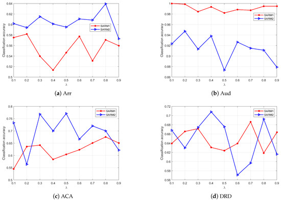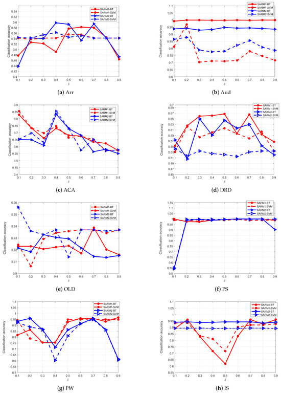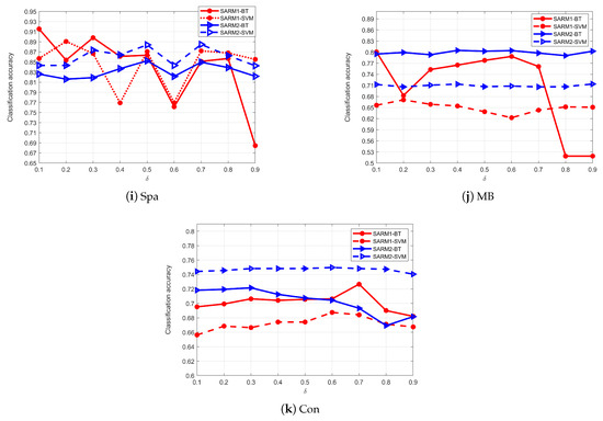 This section describes another parameter, , in SARM1 and SARM2. represents the rate of incomplete labels, and in the above experiments. In many real datasets, cannot be fixed to a value, and sometimes, only a small portion of labels is lost. We need to continue conducting experiments to explore the impact of on the attribute subsets. Given the initial condition, let in the algorithms; the reduced subsets are tested using the BT classifier. Let the incomplete rate , and the step size is 0.1. After executing the algorithms repeatedly, the reduced subsets are found on each value. The BT classifier is used to evaluate the subsets. Figure 6 displays the results. The red line indicates SARM1, and the blue line indicates SARM2. It can be seen from Figure 6 that the curves in most subgraphs are relatively stable and remain within a certain range except where they fluctuate slightly in the subgraph (Spa) and (MB). This indicates that no matter what value takes, the attribute subsets generated by SARM1 and SARM2 have little influence on the classification accuracy. Consequently, we can conclude that SARM1 and SARM2 exhibit relatively stable characteristics and effectiveness in a p-MSVDIS.