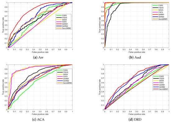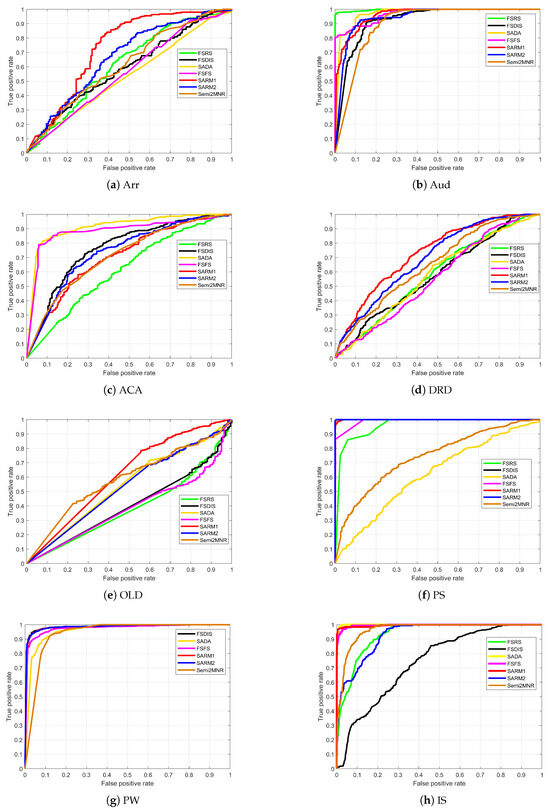 In Figure 3 and Figure 4, the red and blue lines represent SARM1 and SARM2, respectively. It can be seen that the red and blue lines in most of the subgraphs are closer to the upper horizontal border, which indicates that the algorithm in this study is significantly better. In subplots ACA and MB of Figure 3, the red and blue lines are not more convex relative to the frame than other lines, which is consistent with the calculated classification accuracy. The four curves in subplot PS of Figure 3 are overlapped, which shows that the classification effect of the four algorithms is very good. In the subplot OLD of Figure 4, the black, green, and magenta curves are concave, which indicates that the attribute subsets obtained by these three algorithms are poor and generate bad classification accuracy. Table 9 and Table 10 record the areas enclosed by the curves and x-axis in Figure 3 and Figure 4. As evident from the results, SARM1 consistently achieves optimal average AUC scores of 0.8855 and 0.8213 across different experimental conditions. By comparing Table 6 and Table 7 and Table 9 and Table 10, we find that the classification accuracy ranking of each algorithm aligns closely with the corresponding AUC value. This confirms that SARM1 and SARM2 do not suffer from significantly reduced accuracy due to the uneven distribution of samples.