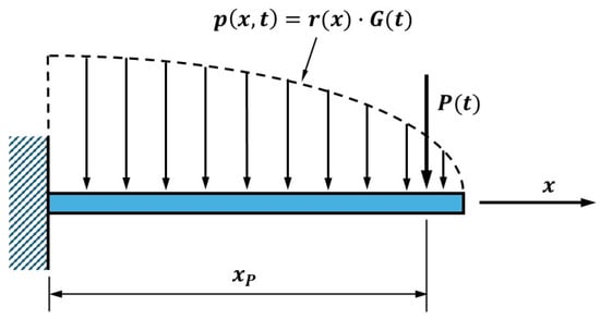 In this way, mathematically, the degrees of freedom of a beam become its own modes of vibration. Therefore, the equations of motion should be written with reference to them. In this sense, the energetic approach (Lagrange’s method) is very useful: it is sufficient to appropriately write the expressions of the kinetic energy, the elastic potential energy, and the work of the external forces as a function of appropriate variables (the so-called Lagrangian variables). For a cantilever beam problem (Figure 1), assuming from the beginning the natural modes of vibration as degrees of freedom, the Lagrangian variables are nothing other than the modal coordinates that weigh the contribution of the individual modes, as described by the following formula (considering only the first modes of vibration of a straight beam):