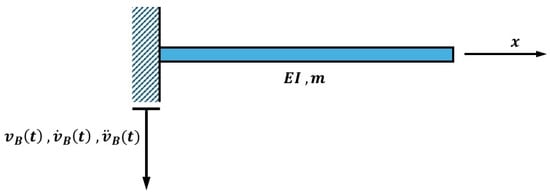 Considering a typical loading condition of vibratory environments (both deterministic and nondeterministic), i.e., the so-called base-driven problem, the input can be represented, for example, by the acceleration applied to the constrained section of the beam. This is the classic model that describes the effects of the actions induced on a civil structure by earthquakes [1] (pp. 544–610), [8,18] or the effects of strong vibrations that stress a satellite and its subsystems, especially during the launch phase [33] (pp. 38–51).